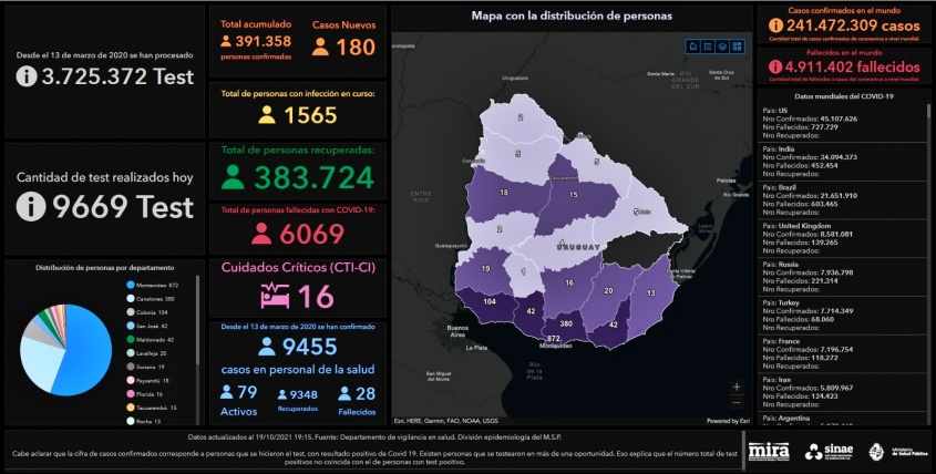 El total de casos positivos confirmados hasta el día de ayer era 391.167. Hoy se reportan 180 casos nuevos y un total de 391.358 casos positivos confirmados. La diferencia se explica, según consigna el MSP, debido a tareas de mejora en la calidad de la base de datos.