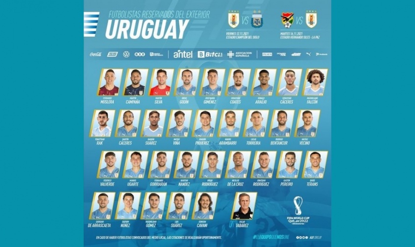 Entre los reservados se encuentran Sebastián Coates y Federico Valverde quienes no podrán jugar el duelo ante Argentina (12 de noviembre) tras haber alcanzado las dos amarillas, pero sí podrán jugar ante Bolivia (16 de noviembre).
