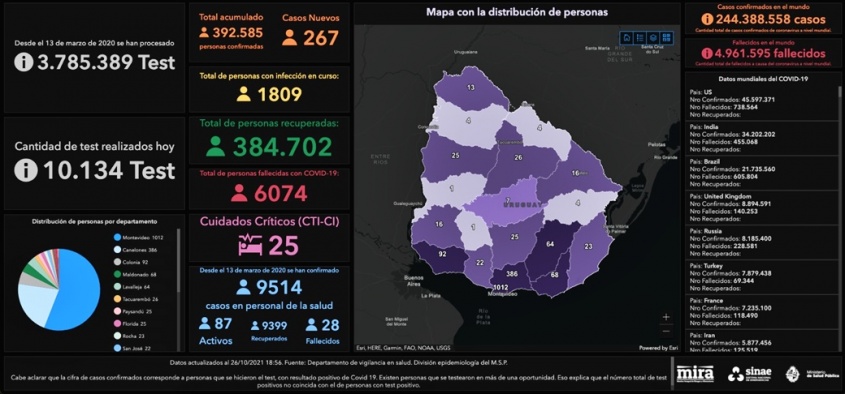 De los 267 nuevos casos, 144 son de Montevideo, 39 de Canelones, 22 de Maldonado, 13 de Lavalleja, 11 de Tacuarembó, 8 de Colonia, 6 de Artigas, 5 de Cerro Largo, 5 de Durazno, 5 de Rocha, 3 de Soriano, 2 de treinta y Tres, 1 de Florida, 1 de Paysandú, 1 de Río Negro y 1 de Salto.