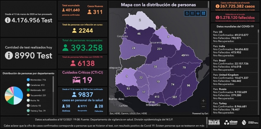 Los 8.990 análisis realizados, permitieron detectar 311 nuevos casos de los que 124 son de Montevideo, 50 de Canelones, 29 de Maldonado, 28 de Tacuarembó, 18 de Lavalleja y 16 de Rocha.