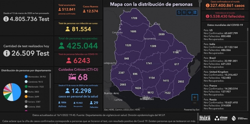 De acuerdo a la información proporcionada por el Ministerio de Salud Pública (MSP), hoy se llevaron a cabo 26.509 análisis y se detectaron 12.574 nuevos casos de Coronavirus COVID-19.