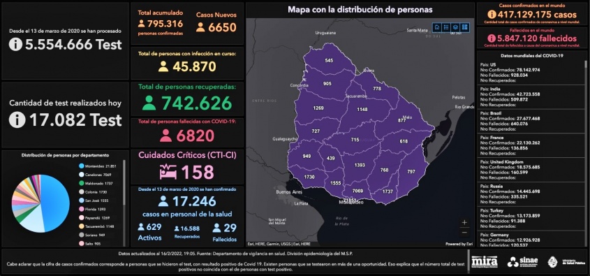 De los 6.650 casos nuevos, 2.900 son de Montevideo, 1.013 de Canelones, 283 de Colonia, 269 de Maldonado, 256 de Florida, 231 de Paysandú, 203 de Tacuarembó, 199 de San José, 161 de Salto, 158 de Cerro Largo, 142 de Rocha, 140 de Lavalleja, 110 de Rivera, 109 de Soriano, 107 de Río Negro, 97 de Durazno, 97 de Treinta y Tres, 89 de Artigas y 86 de Flores.