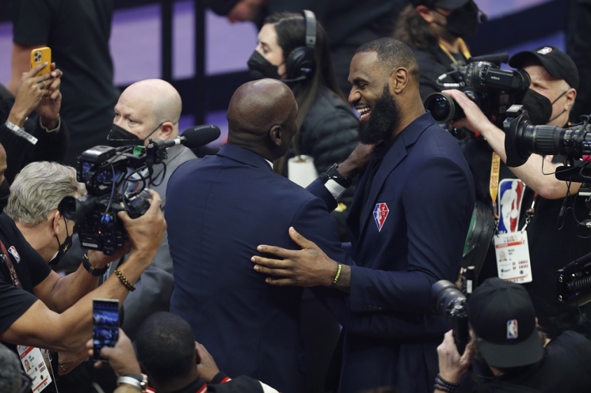 "No quería perder la oportunidad de dar la mano al hombre que me inspiró a lo largo de mi infancia", dijo LeBron en la rueda de prensa posterior al partido. "No he tenido muchas conversaciones con él en mis 19 años en este negocio, pero una parte de mí no estaría aquí sin la inspiración de MJ (Michael Jordan). De niño siempre quise ser como él", añadió.LeBron James y Michael Jordan se dieron un gran abrazo en la cancha durante el descanso del All-Star, un momento de la noche que la NBA aprovechó para rendir homenaje a los 75 mejores jugadores de su historia.