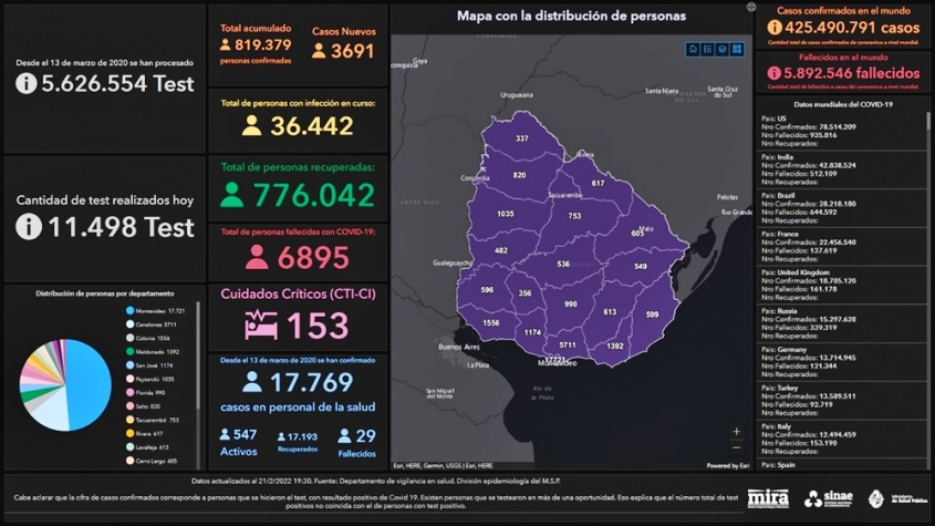 De los 3.691 nuevos casos, 1840 son de Montevideo, 546 de Canelones, 231 de Colonia, 128 de Maldonado, 126 de Salto, 101 de Lavalleja, 97 de San José, 90 de Paysandú, 88 de Florida, 72 de Treinta y Tres, 67 de Soriano, 66 de Río Negro, 47 de Rivera, 45 de Rocha, 40 de Flores, 33 de Tacuarembó, 27 de Cerro Largo, 24 de Artigas y 23 de Durazno.