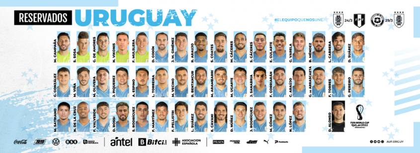 DELANTEROS: Luis Suárez (Atlético de Madrid, España), Edinson Cavani (Manchester United, Inglaterra), Darwin Núñez (Benfica, Portugal), Jonathan Rodríguez (Al Nassr), Maximiliano Gómez (Valencia, España), Nicolás López (Tigres, México), Diego Rossi (Fenerbahce, Turquía), Santiago Rodríguez (New York City, Estados Unidos), Federico Martínez (León, México), Facundo Pellistri (Alavés, España).