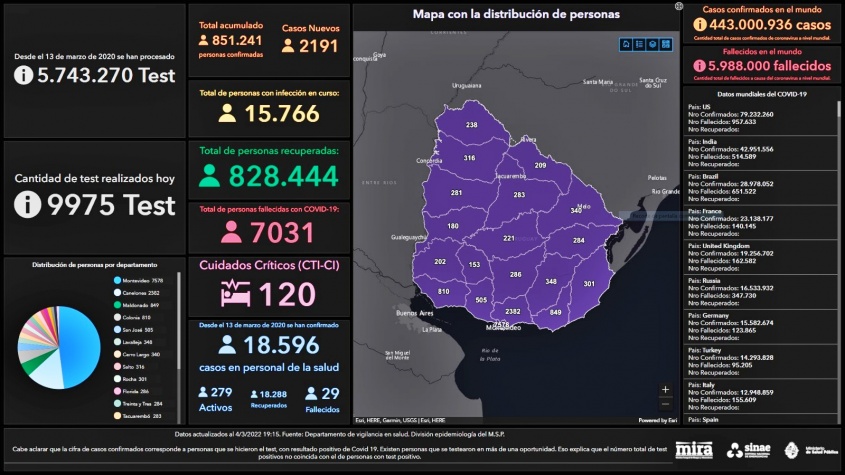 De los 2.191 nuevos casos, 980 son de Montevideo, 344 de Canelones, 132 de Colonia, 111 de Maldonado, 85 de San José, 55 de Cerro Largo, 48 de Lavalleja, 45 de Tacuarembó, 43 de Durazno, 43 de Florida, 43 de Rocha, 42 de Rivera, 41 de Salto, 32 de Río Negro, 32 de Soriano, 30 de Paysandú, 29 de Flores, 28 de Artigas y 28 de Treinta y Tres.