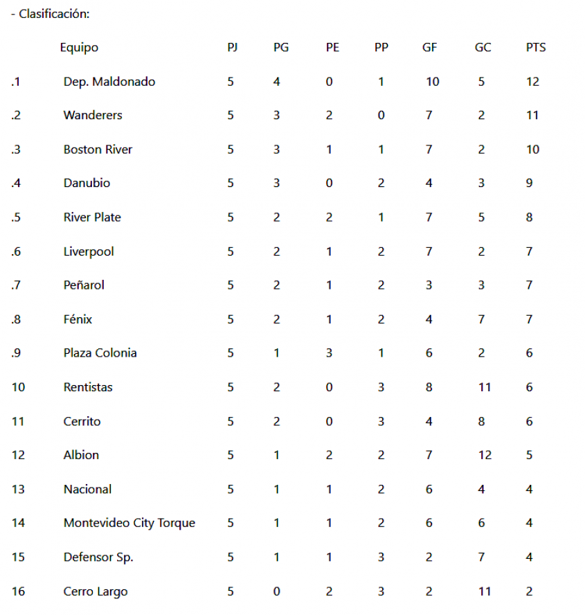 El sábado, el Boston River registró una victoria frente al Fénix por 2-0 y el Defensor Sporting empató sin goles con el Plaza Colonia, mientras que el pasado viernes Cerrito le ganó a Rentistas por 2-1 con goles de Michel Sosa y Facundo Rodríguez.