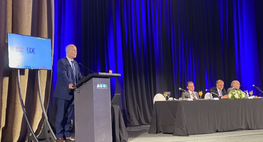 Por su parte, el presidente del Partido Nacional, Pablo Iturralde, también compartió en su cuenta de Twitter: "AHORA Junto a los Ptes. de los Partidos Políticos de la coalición disertando en desayuno de trabajo de @ADMUruguay"