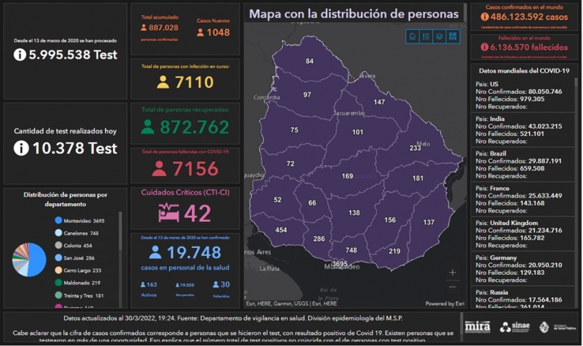 También se informó que de los 1.048 nuevos casos, 581 son de Montevideo, 124 de Canelones, 50 de Colonia, 42 de San José, 35 de Cerro Largo, 35 de Maldonado, 29 de Florida, 27 de Tacuarembó, 25 de Lavalleja, 22 de Durazno, 14 de Salto, 12 de Rivera, 12 de Rocha, 11 de Flores, 11 de Treinta y Tres, 7 de Paysandú, 4 de Río Negro, 4 de Soriano y 3 de Artigas.
