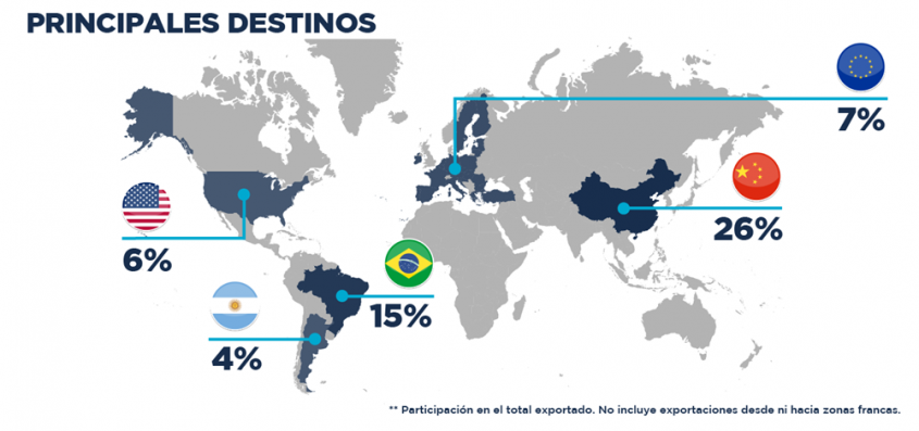 En el primer trimestre de 2022, las exportaciones totalizaron US$ 2.896 millones. Esta cifra significa un aumento de 37% en la comparación interanual. El dinamismo de las ventas viene dado por la carne bovina, seguido por el trigo y los vehículos.