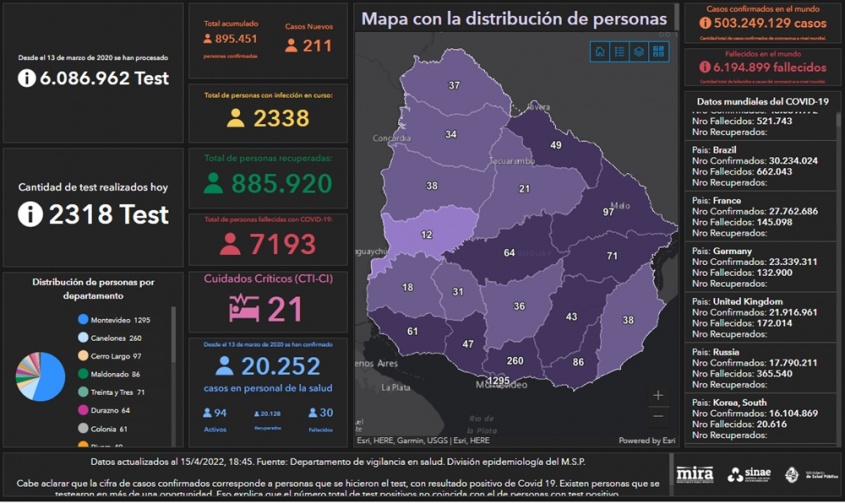 Desde que se declaró la emergencia sanitaria el 13 de marzo de 2020 se han procesado 6.086.962 test y se han registrado 895.451 casos positivos de Coronavirus en todo el territorio nacional. De ese total 885.920 ya se recuperaron.