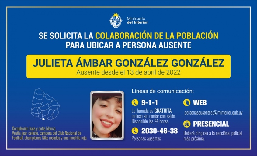 Se trata de Julieta Ambar Gonzalez Gonzalez, ausente desde el pasado 13 de abril, informó el Ministerio del Interior.