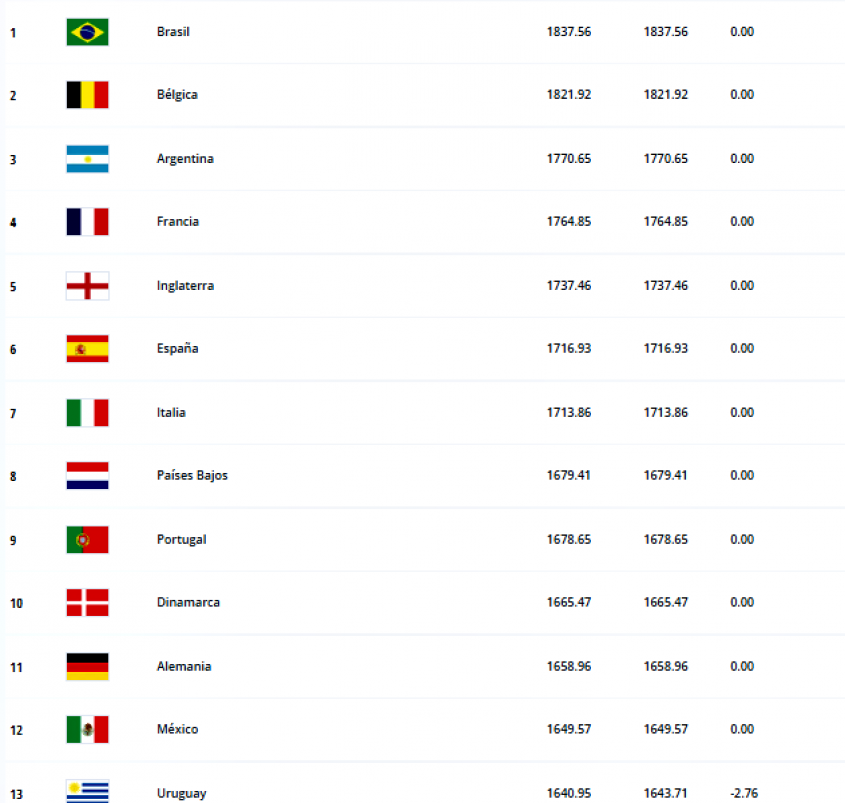 Francia, Inglaterra, España, Italia (que no disputará el mundial), Países Bajos, Portugal y Dinamarca completan las diez primeras posiciones.