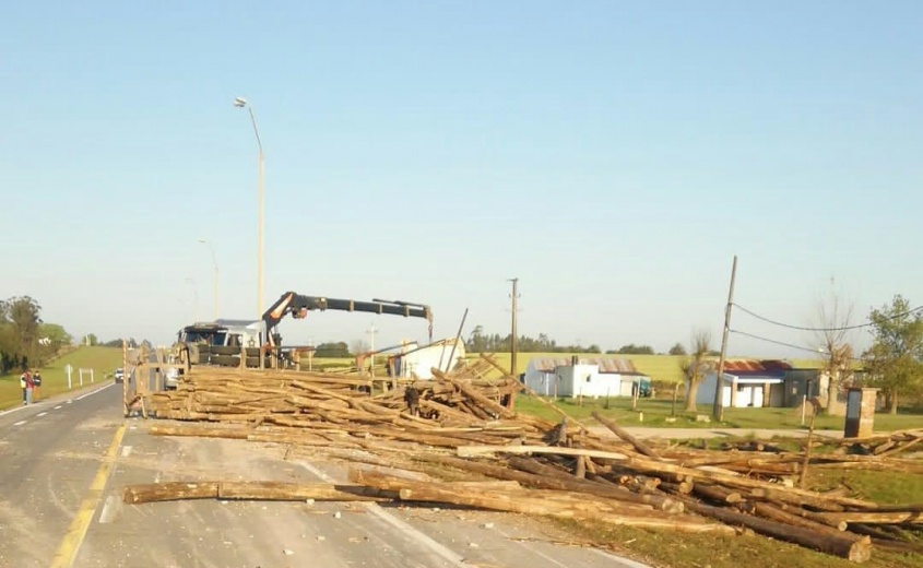 Un camión con semirremolque que transportaba palos, circulaba por ruta 11 de Este a Oeste, y al llegar al km 114 por motivos que se desconocen perdió el domino del vehículo e impactó contra 3 columnas de alumbrado público.