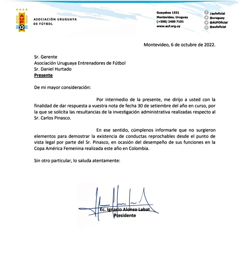“No hay conductas reprochables” en el caso que involucró a Carlos Pinasco informó la Asociación Uruguaya de Fútbol (AUF) tras la investigación que realizó respecto a las quejas por un supuesto acoso del ahora ex entrenador de goleras de la selección femenina de fútbol.