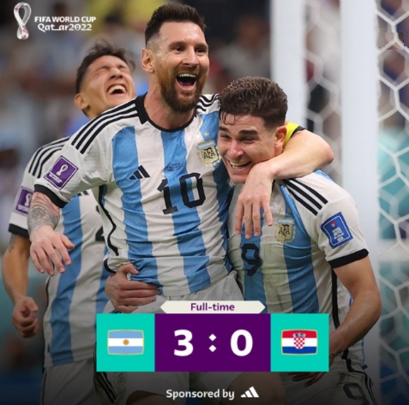 La Albiceleste aprovechó dos errores del conjunto croata de pelota detenida para sentenciar el choque antes del descanso. Julián Álvarez se convirtió en el hombre del partido, tras forzar el penal del primer gol y anotar dos goles, con el permiso de un Leo Messi, que volvió a dar una clase magistral liderando el juego de su equipo y guiando a su selección a la que será su sexta final mundialista.
