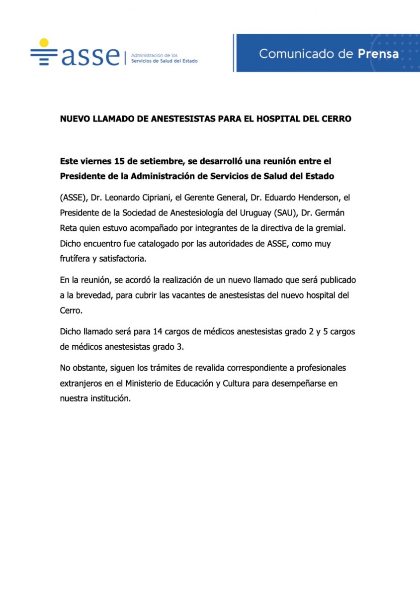 Ello se debe a la falta de estos especialistas en el país y ante una vacante a cubrir en el hospital del Cerro.
