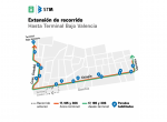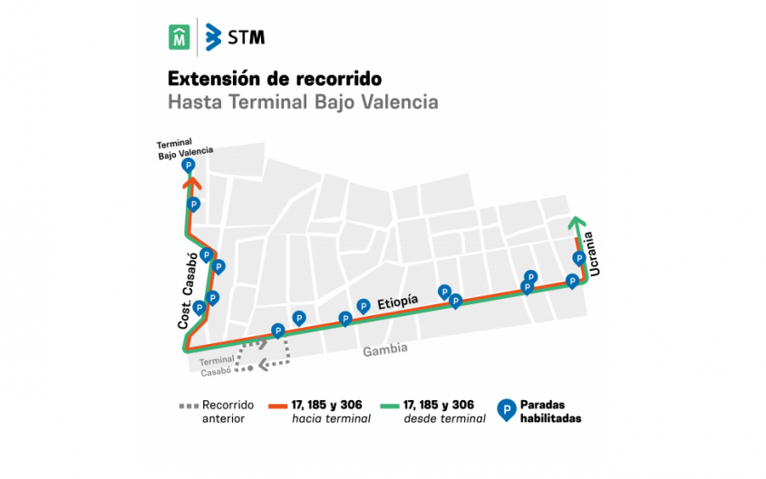 Respecto al recorrido, cuando circulan hacia la terminal Bajo Valencia, desde la intersección de las calles Etiopía y Ucrania, las líneas continuarán su ruta por Etiopía, costanera Casabó, Terminal. En tanto, cuando circulan con salida desde la terminal, saldrán por costanera Casabó, Etiopía, hacia sus rutas habituales.