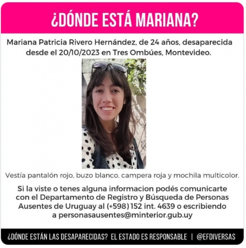 Mariana Patricia Rivero Hernández, de 24 años, desaparecida desde el 20/10/2023 en Tres Ombúes, Montevideo #NoEstamosTodas pic.twitter.com/zQD099kcGK
