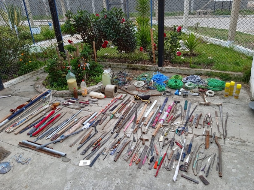En Modulo 2: ocupado por 325 privados de libertad, se incautaron: 21 cortes de fabricación carcelaria, tornillos, 1 regla de construcción, hierro, cables, 20 destornilladores, 1 pinza, 1 pieza de tornería, 30kg de portland, 1 llave térmica, 2 discos de amoladora, cables varios, 1 tarrina con pintura, 1 mangera, 8 bloques, 1 cepillo carpintero, 2 teléfonos celulares y una batería de celular.