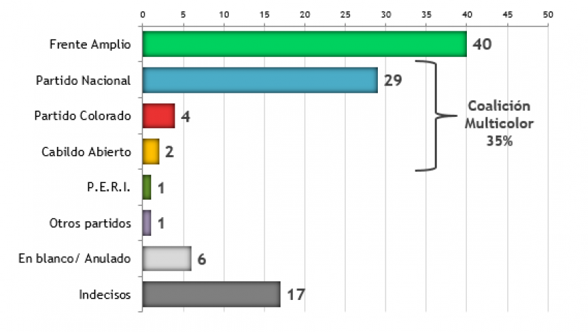 Desglosado: un 40% indicó que se inclinaría por el Frente Amplio, 29% por el Partido Nacional, 4% por el Partido Colorado y 2% por Cabildo Abierto.