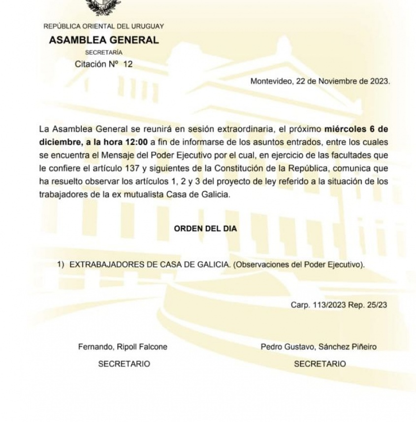 El miercoles 6 de diciembre se realizará una Asamblea General en una sesión extraordinaria para tratar el veto parcial del presidente Lacalle Pou a la Ley que atiende a la situación y las indemnizaciones de los ex trabajadores de Casa de Galicia.