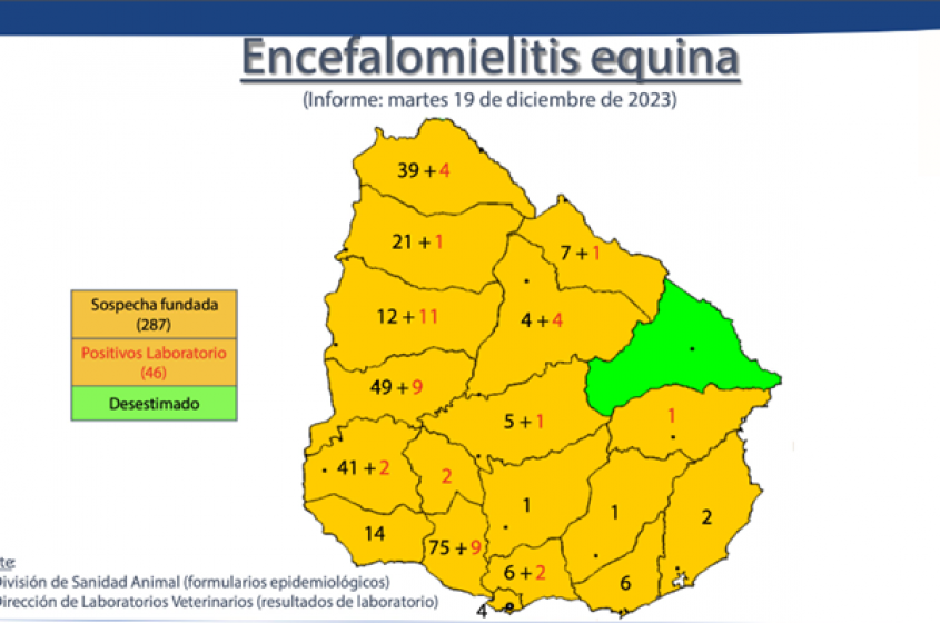 De acuerdo a las muestras procesados por #DILAVE de la Dirección General de Servicios Ganaderos, la cantidad de casos confirmados de encefalomielitis equina en Uruguay al 19 de diciembre es de 46 casos positivos. 👇https://t.co/Ne0zkX2Jr5 pic.twitter.com/FjxWNrNMKT