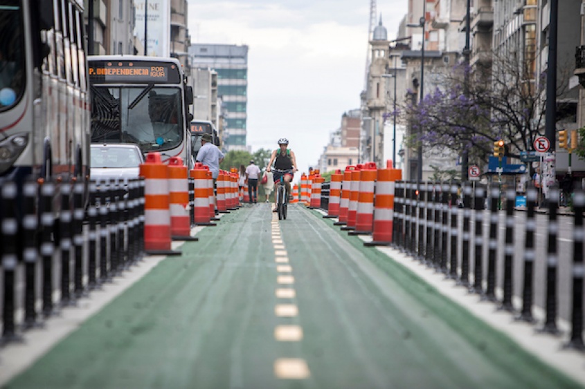 Está delimitada por elementos físicos, protegiendo a las personas que utilizan la bicicleta en la principal avenida.