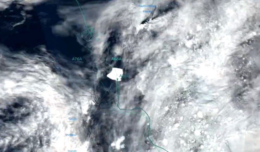 Entre las nubes y el hielo marino, el iceberg -de unos 4.000 kilómetros cuadrados- se muestra junto a las huellas de los grandes icebergs anteriores A68 y A76a. La animación ha sido compilada por el BAS (British Antarctic Surve) a partir de imágenes del satélite Copernicus Sentinel-3.
