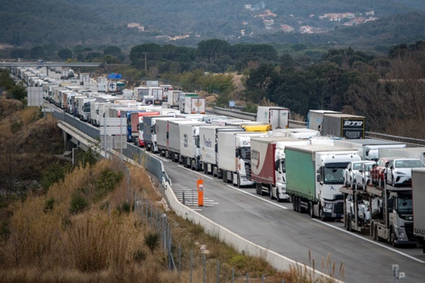 Eso ha provocado una larga cola de camiones procedentes de España porque los tractores les bloquean el paso, sin incidentes pasadas las 12.30.