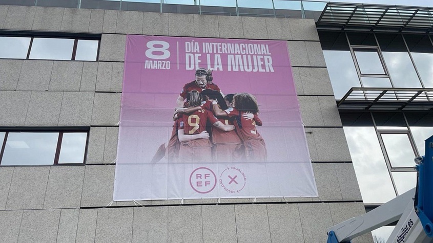 La RFEF empezó así los actos por el Día de la Mujer, vistiendo su fachada con un homenaje a las mujeres, representadas por las campeonas del mundo en dicha lona. Además, las redes sociales de la Federación se teñirán de morado, color asociado a esta fecha señalada.