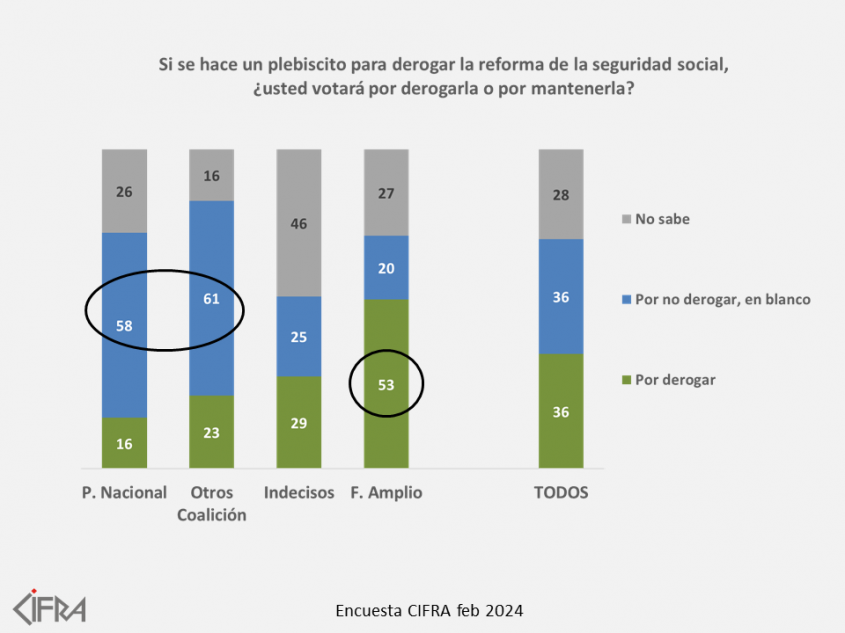 La encuestadora Cifra publicó un informe donde, según un sondeo realizado entre el 1 y 17 de febrero, hay un empate de 36% entre quienes votarían a favor de derogar la reforma al sistema jubilatorio que se aprobó en abril de 2023 y quienes no. Por otra parte, existe un 28% que aún no tiene opinión al respecto.