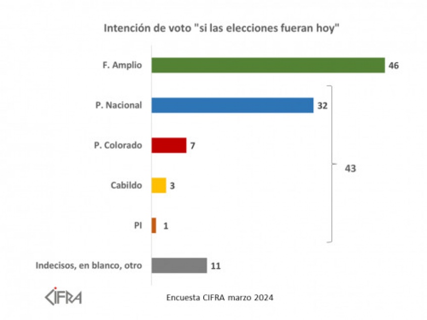Si las elecciones nacionales fueran hoy, un 46% de los uruguayos votaría al Frente Amplio; en tanto que el 32% al Partido Nacional. Esta información se desperende de la última encuesta realizada y publicada por Cifra este jueves en Canal 12.