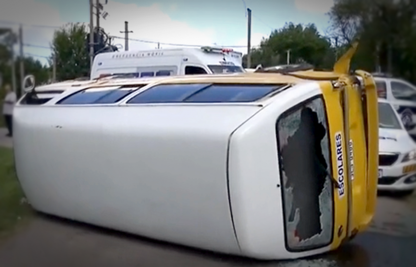 Una camioneta con escolares volcó luego de ser chocada por un camión de repartos, en el mediodía de este lunes, en el barrio Piedras Blancas de Montevideo.