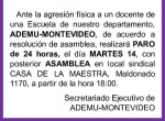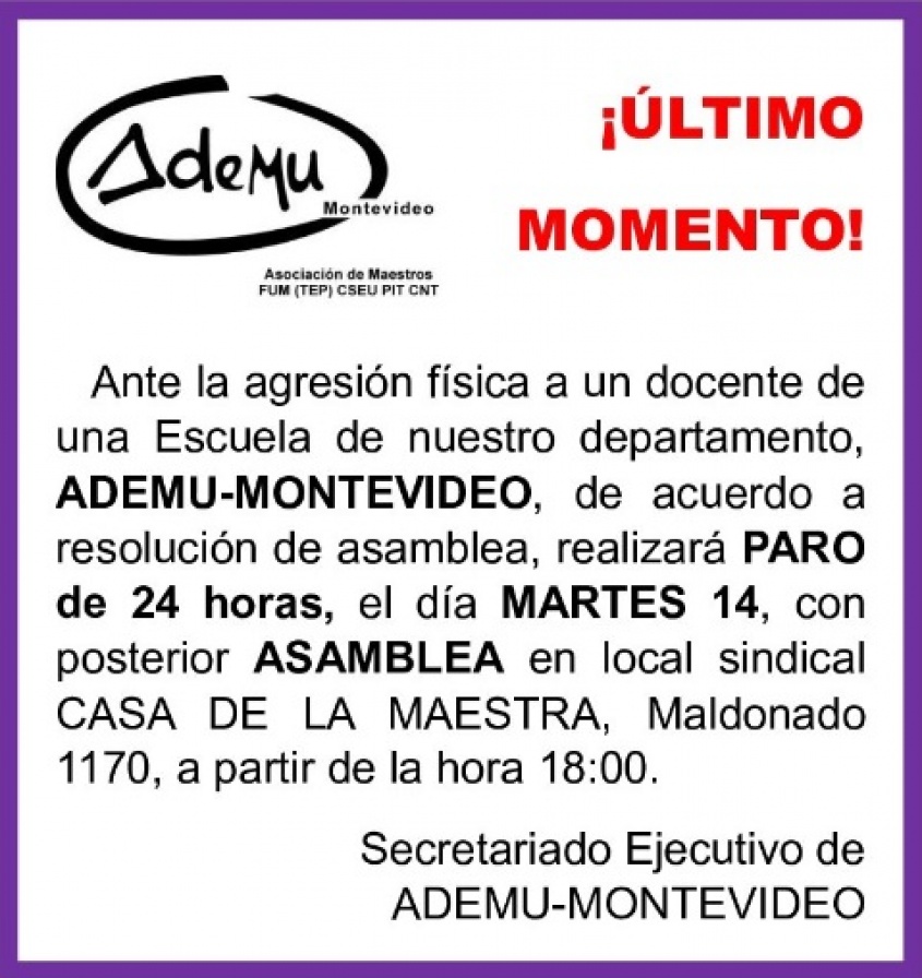 La misma se llevará a cabo en el local sindical "Casa de la Mestra", calle Maldonado 1170, a partir de las 18:00 horas, según confirmó a Monte Carlo el secretariado Ejecutivo de ADEMU-Montevideo.