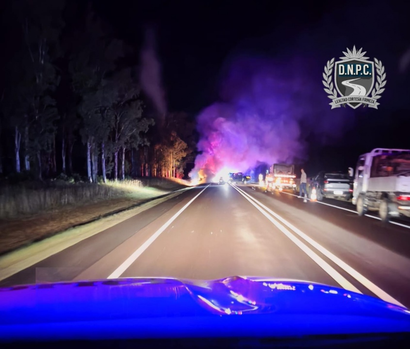 El vehículo era de una empresa de turismo, perteneciente al departamento de Paysandú, y estaba detenido por una falla mecánica sobre la banquina al momento que tomó fuego.