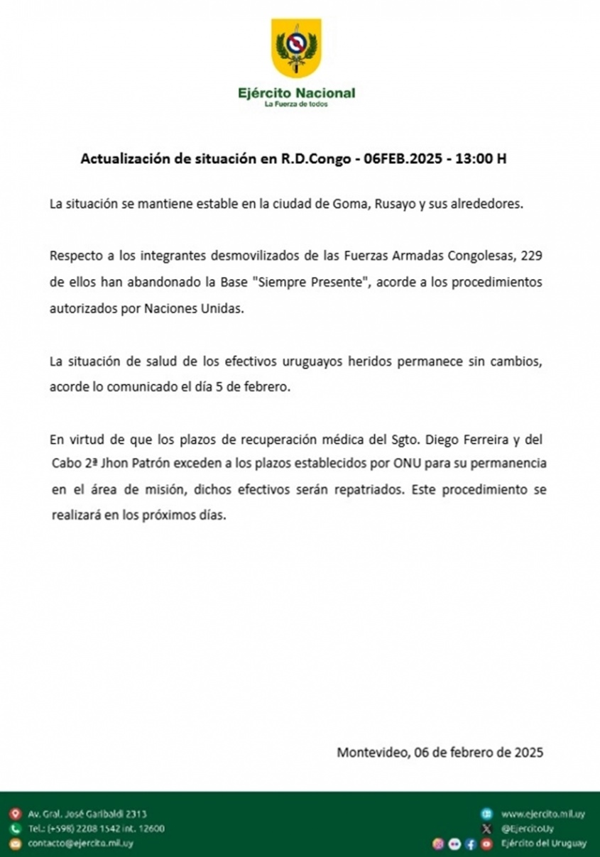 En tanto, la situación se mantiene estable en la ciudad de Goma, Rusayo y sus alrededores. Además, 229 de los integrantes desmovilizados de las Fuerzas Armadas Congolesas han abandonado la base "Siempre Presente", acorde a los procedimientos autorizados por Naciones Unidas, finaliza el comunicado del Ejército uruguayo.