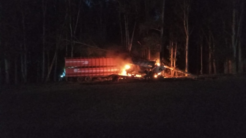 Según la información primaria de Policía Caminera, el camión con jaula de ganado que circulaba de Norte a Sur, despistó hacia la banquina, se prendió fuego y sus dos ocupantes quedaron atrapados en el habitáculo.
