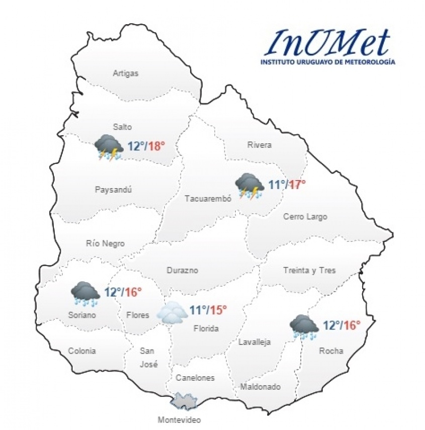 Para Montevideo y el Área Metropolitana se anuncia una jornada fresca con cielo nuboso y cubierto. Precipitaciones aisladas. La máxima anunciada es de 15º C y la mínima 11º C.