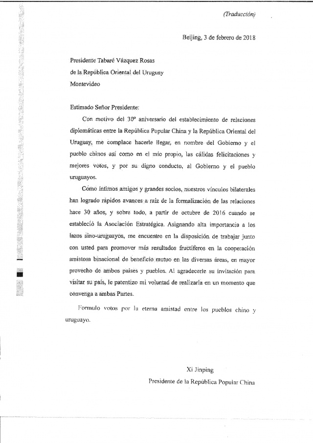 En un pasaje de la misiva, Xi Jinping manifestó que “como íntimos amigos y grandes socios, nuestros vínculos bilaterales han logrado rápidos avances a raíz de la formalización de las relaciones hace 30 años, y sobre todo, a partir de octubre de 2016 cuando se estableció la Asociación Estratégica”.