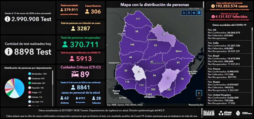 De los 306 nuevos casos, 129 de Montevideo, 28 de Canelones, 22 de Maldonado, 17 de Paysandú, 16 de Artigas, 14 de Colonia, 14 de Rocha, 13 de Cerro Largo, 13 de Salto, 10 de San José, 9 de Treinta y Tres, 7 de Florida, 3 de Río Negro, 3 de Soriano, 2 de Durazno, 2 de Lavalleja, 2 de Rivera y 2 de Tacuarembó.