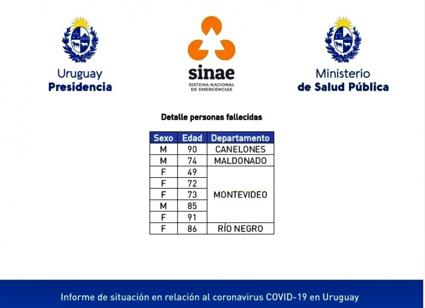 Hoy se confirmaron 8 fallecimientos con diagnóstico de SARS-CoV-2 en nuestro país (se anexa tabla con detalle). Hasta el momento son 5.913 las defunciones con diagnóstico de COVID-19 en Uruguay.