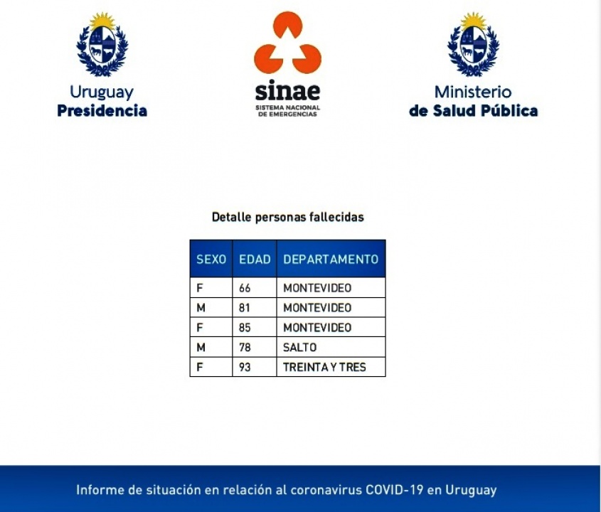 Hoy se confirmaron 5 fallecimientos con diagnóstico de SARS-CoV-2 en nuestro país (se anexa tabla con detalle). Hasta el momento son 5.936 las defunciones con diagnóstico de COVID-19 en Uruguay.
