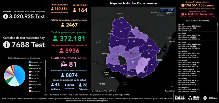 De los 164 nuevos casos, 73 de Montevideo, 21 de Canelones, 9 de Maldonado, 9 de Rivera, 8 de Colonia, 8 de San José, 6 de Paysandú, 6 de Salto, 5 de Artigas, 4 de Cerro Largo, 3 de Durazno, 3 de Soriano, 3 de Treinta y Tres, 2 de Florida, 2 de Río Negro, 1 de Rocha y 1 de Tacuarembó.