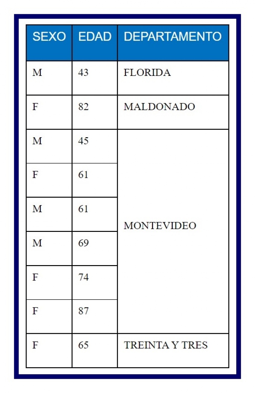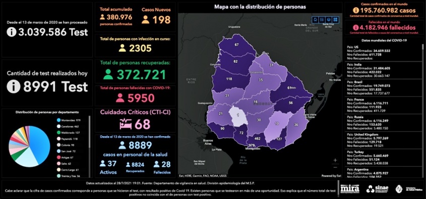 De los 198 nuevos casos, 87 de Montevideo, 40 de Canelones, 13 de Maldonado, 8 de Salto, 7 de Paysandú, 6 de Artigas, 6 de Cerro Largo, 6 de Rocha, 6 de San José, 6 de Tacuarembó, 4 de Colonia, 3 de Florida, 2 de Rivera, 2 de Soriano, 1 de Río Negro y 1 de Treinta y Tres.