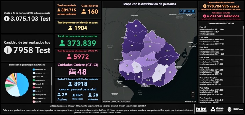 De los 160 nuevos casos, 88 de Montevideo, 21 de Colonia, 17 de Canelones, 6 de Maldonado, 4 de Artigas, 4 de Treinta y Tres, 3 de Río Negro, 3 de Rocha, 3 de Paysandú, 2 de Salto, 2 de San José, 2 de Tacuarembó, 1 de Cerro Largo, 1 de Durazno, 1 de Flores, 1 de Florida y 1 de Lavalleja.