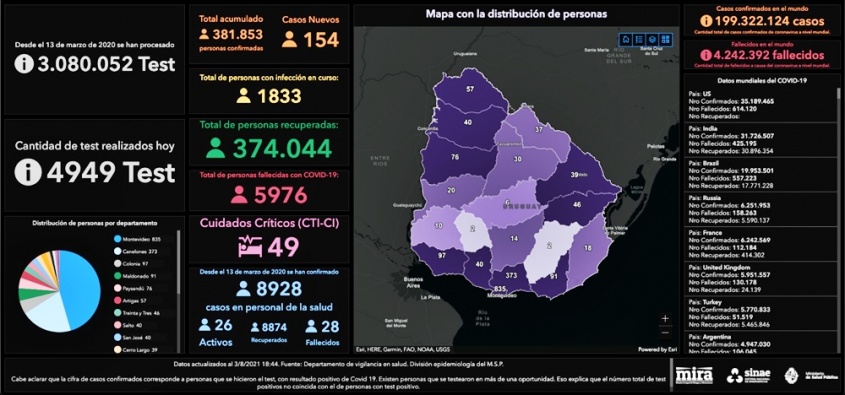 De los 154 nuevos casos, 83 de Montevideo, 23 de Canelones, 10 de Artigas, 8 de Tacuarembó, 7 de Maldonado, 6 de Rivera, 5 de Paysandú, 4 de Colonia, 3 de Salto, 2 de Soriano, 1 de Florida, 1 de Lavalleja y 1 de San José.