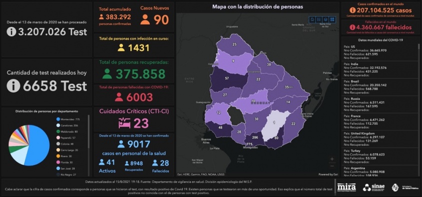 De los 90 nuevos casos, 54 son de Montevideo, 11 de Canelones, 6 de Rivera, 4 de Maldonado, 4 de Paysandú, 3 de Artigas, 3 de Colonia, 2 de Cerro Largo, 2 de San José y 1 de Salto.