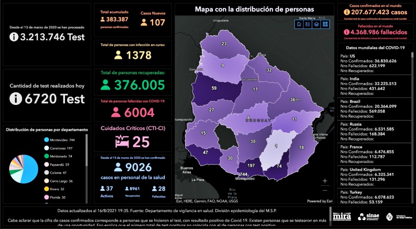 De los 107 nuevos casos, 57 son de Montevideo, 13 de Canelones, 7 de Paysandú, 6 de Rivera, 4 de Cerro Largo, 4 de Florida, 4 de Maldonado, 3 de Colonia, 3 de Soriano, 2 de San José, 1