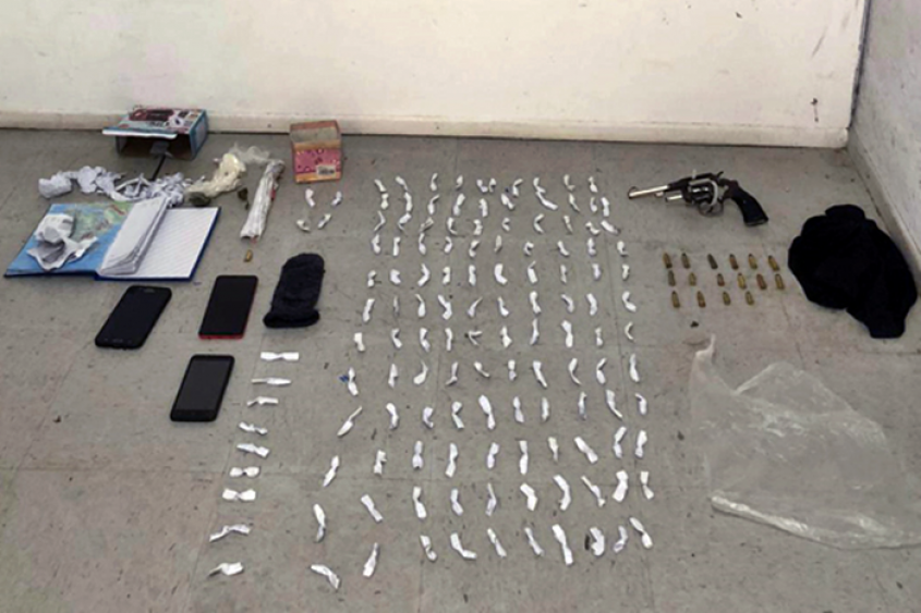Posteriormente se volvió a inspeccionar la vivienda desde la que el hombre se había dado a la fuga logrando detenerlo junto a una mujer e incautar un revólver con seis proyectiles vivos, 133 envoltorios con sustancia blanca, tres celulares y 5.300 pesos en cambio, papeles y cuadernos.